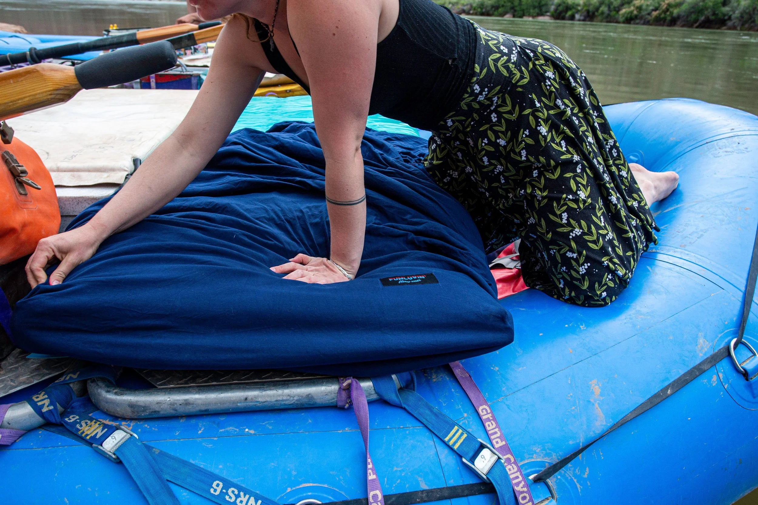 One side of the cover is made of anti-pill fleece which will keep you extra warm on those chilly early season and late season river trips. The other side is made of a stretchy jersey knit cotton fabric which makes it perfect for summer river trips! The Cuddle Buddy has elastic sewn all the way around the outside, with reinforced elastic around the corners to ensure the cover stays on the pad!